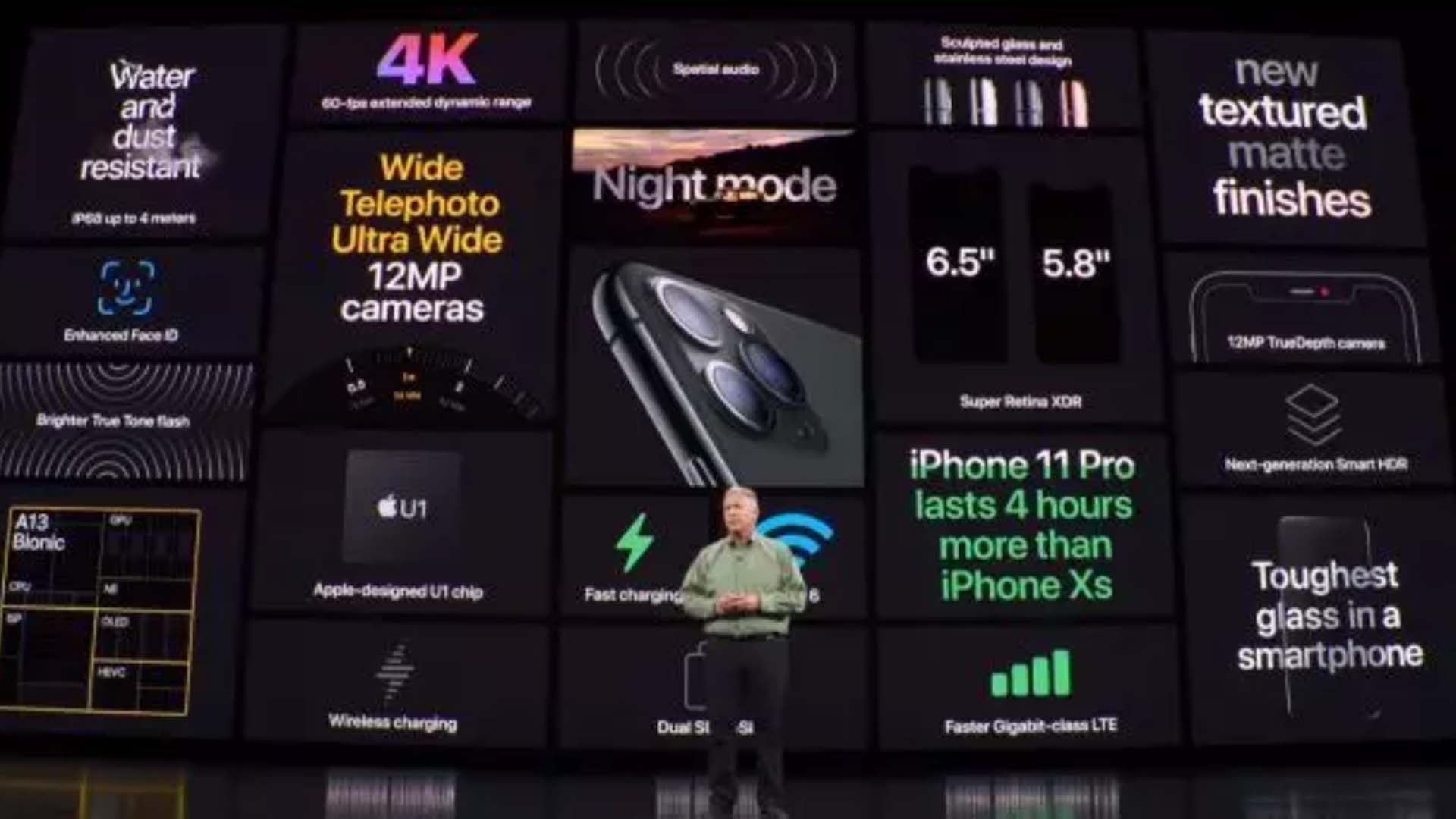 兩個版本iPhone 11 Pro和iPhone 11 Pro Max,4款顏色銀白色、金色、深空灰、暗夜綠,全新顯示屏,1200尼特。
